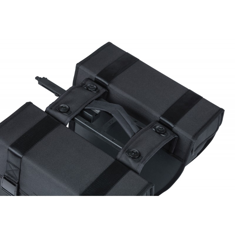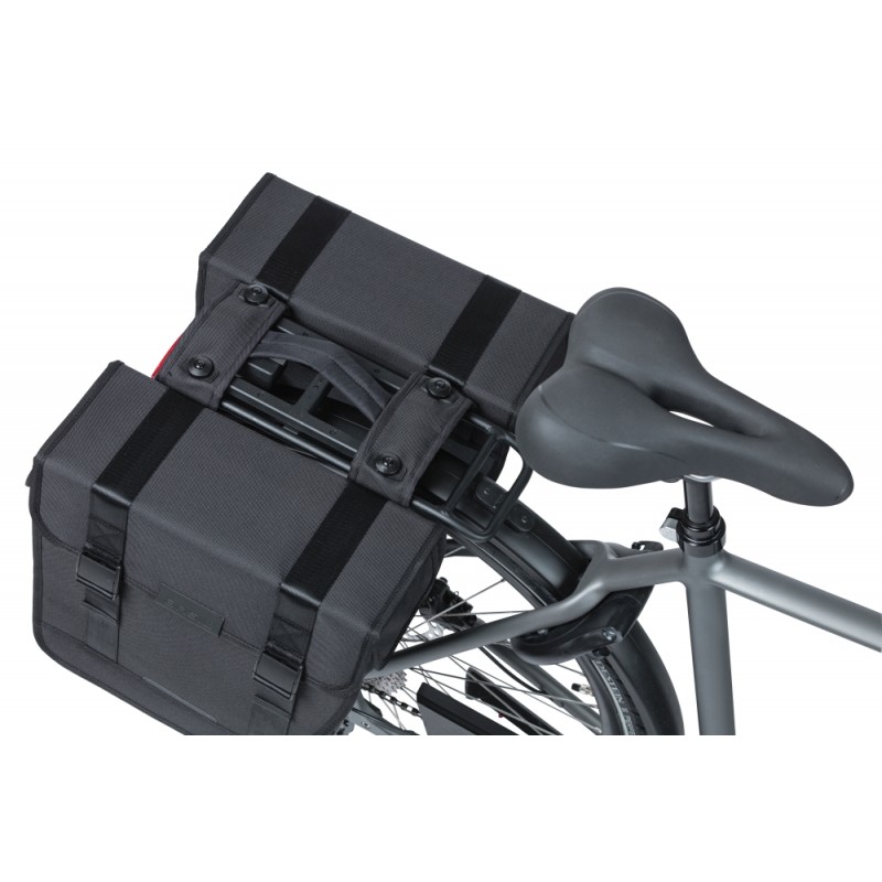La "Basil Tour" est une sacoche de vélo double élégante d'une capacité de 28 litres. Les sacoches de vélo noires conviennent aux porte-bagages ou aux plaques de support MIK.